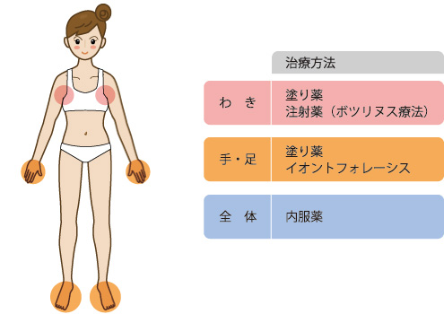 原発性多汗症は塗り薬、注射、イオントフォレーシスなどの治療を行います。続発性多汗症は原因となる病気を先に治療する必要があります。